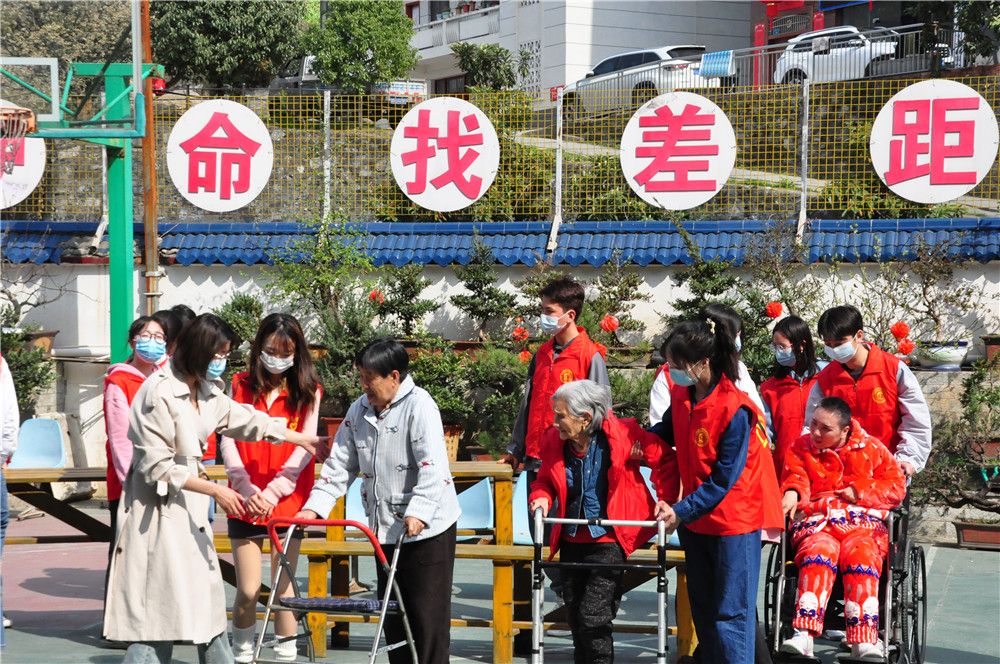 志愿者们于图书馆门前集合,成三路纵队,有组织有纪律地步行前往阳光爱心护理院。志愿者们的到来给平日清净的敬老院带来阵阵欢笑声,院内洋溢着温馨、祥和的气氛。他们热情地问候老人,为老人送上诚挚的祝福。志愿者们有的陪老人聊天,询问其身体和生活状况;有的为老人捏肩捶背,做些力所能及的事情;有的则在一旁进行节目排练。老人们也一一询问志愿者们所学的专业以及未来的职业发展,希望同学们年少应有为,为国家、为社会作出更大的贡献。