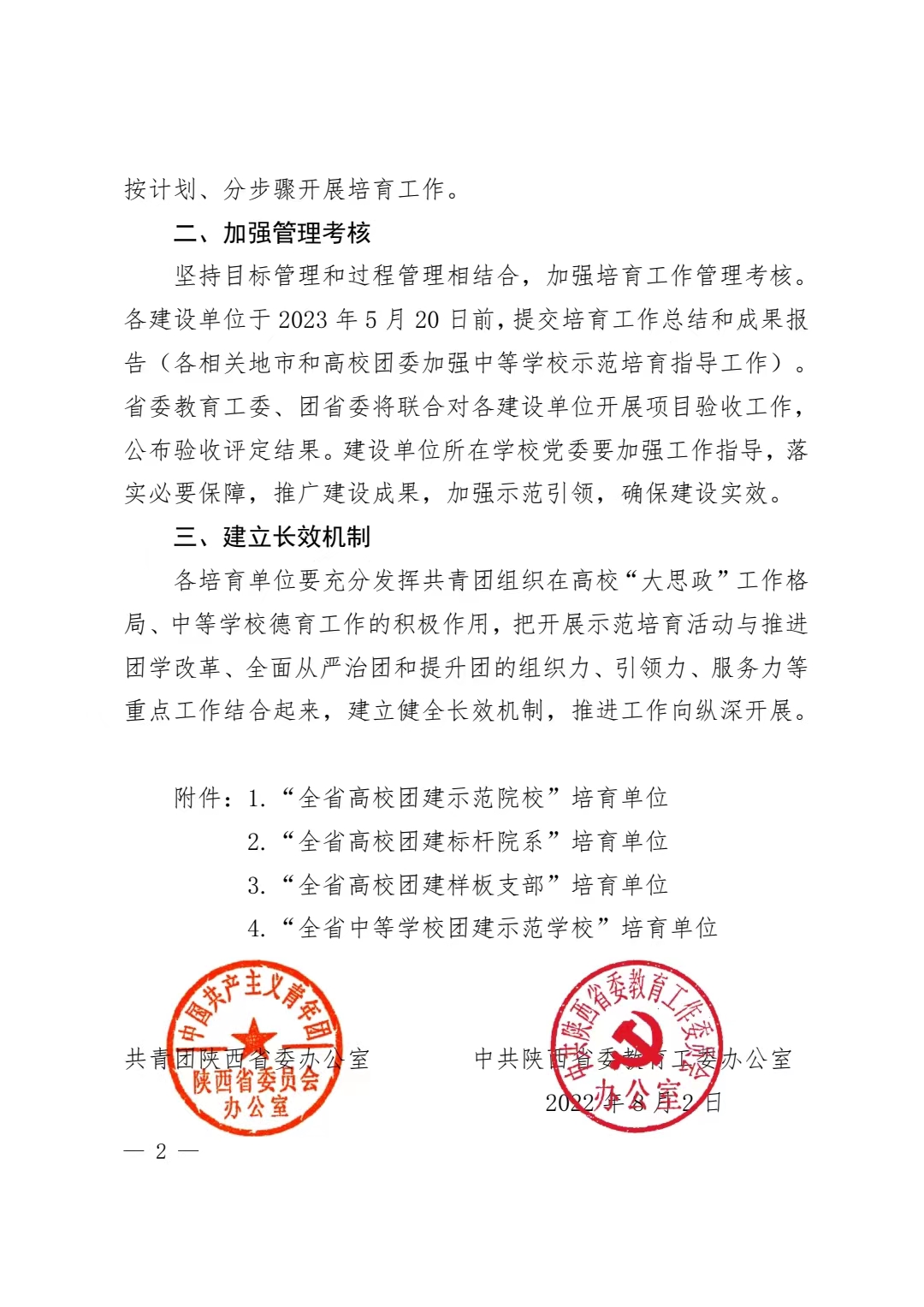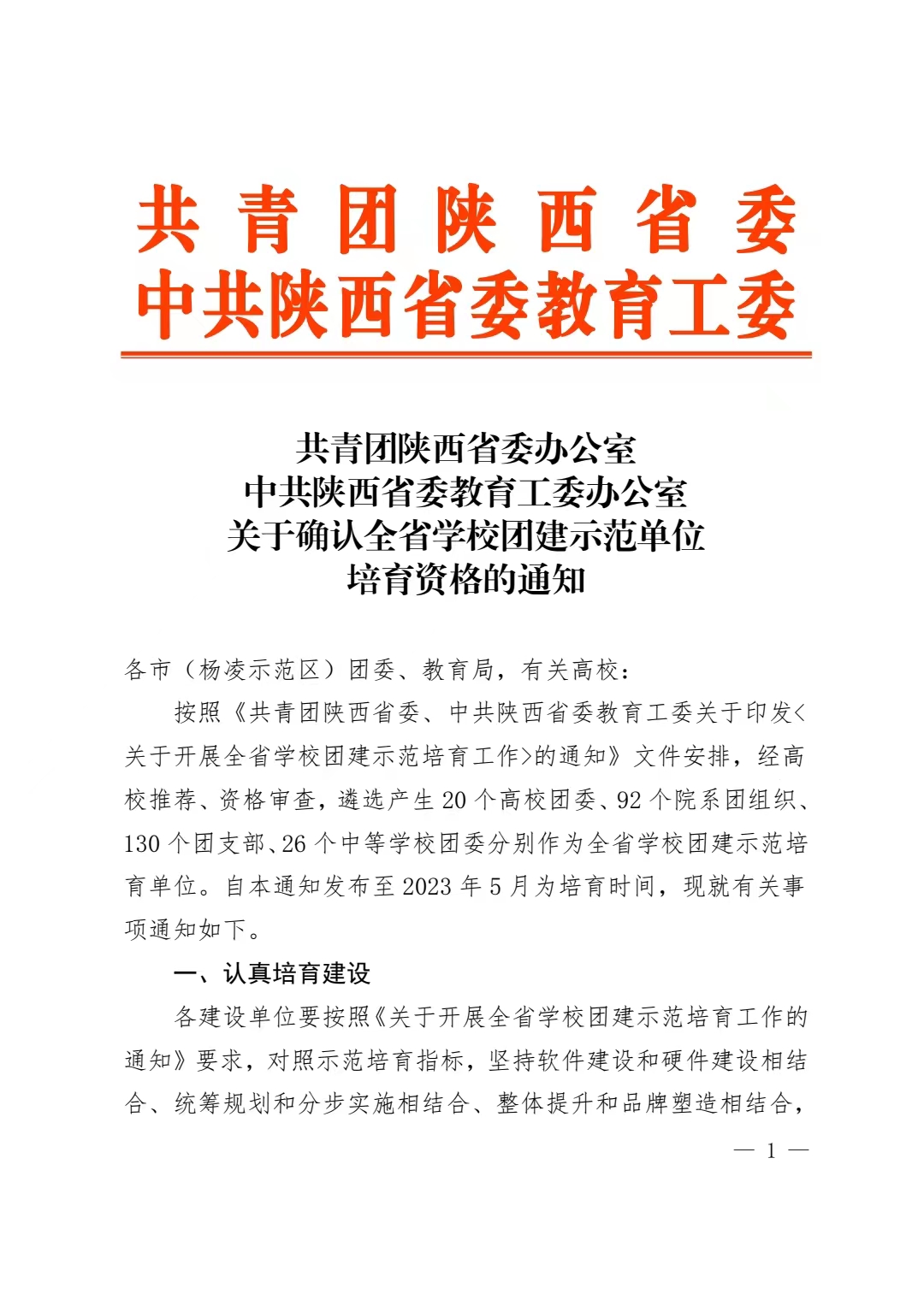 近日,共青团陕西省委和陕西省委教育工委联合印发了《关于确认全省公司团建示范单位培育资格的通知》。公司团总支入选“全省高校团建标杆院系”培育单位。