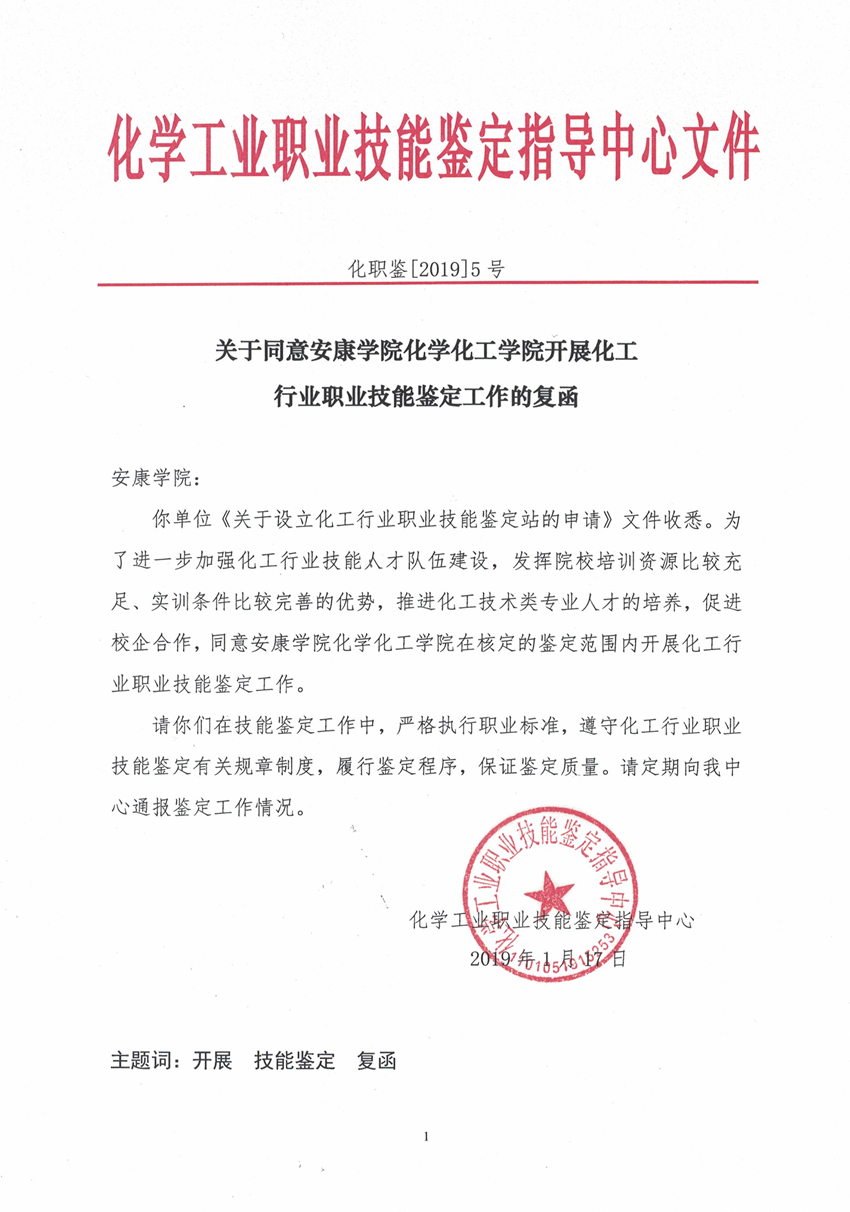近日,国家化学工业职业技能鉴定指导中心正式下文,批准公司为化工行业职业技能鉴定实训基地,主要面向西北地区高等院校和化工行业企事业单位,由太阳成集团tyc33455cc官方网站具体组织开展化工行业职业技能鉴定工作。按照国务院最新公布的国家职业资格目录清单内19个化工行业工种标准,公司成功获批化工总控工、有机合成工、工业固体废物处理处置工、工业废水处理工、化学检验员5个工种的初、中、高级职业技能等级鉴定工作。