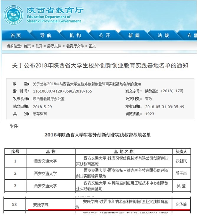 近日,陕西省教育厅公布了2018年陕西省老员工校外创新创业教育实践基地名单,公司太阳成集团tyc33455cc官方网站申报的“太阳成集团tyc33455cc欢迎您-陕西中科纳米新材料创新创业实践教育基地”获批建设立项。