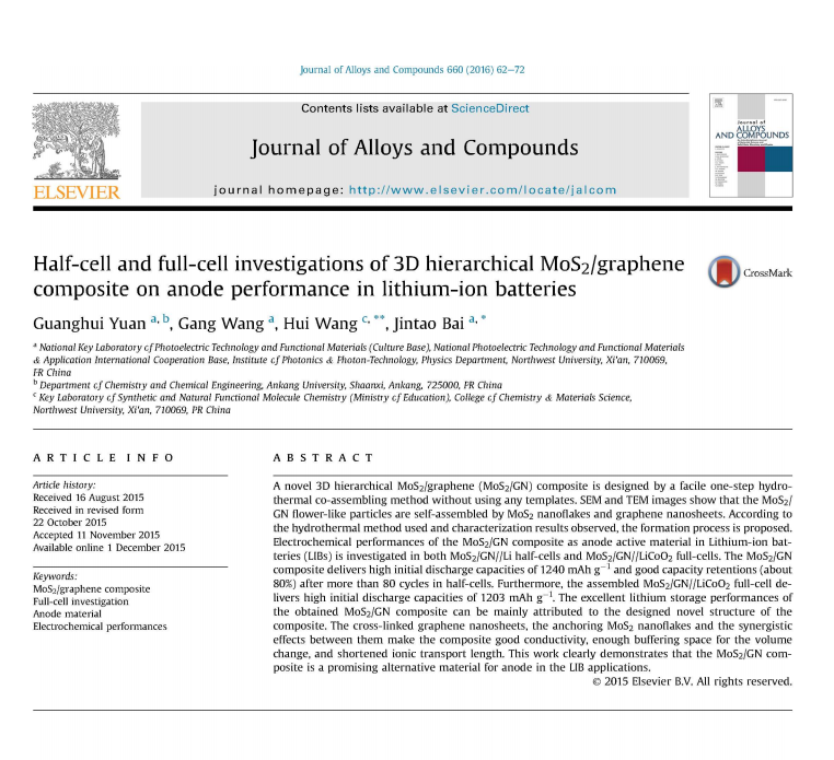 袁光辉的论文主要对具有二维层状结构的MoS2和石墨烯进行二维异枝结设计制备,利用MoS2纳米片和石墨烯纳米层的协同作用提高材料的储锂性能。论文通过对MoS2/石墨烯复合材料在锂离子半电池和全电池中电化学行为的研究,提出了MoS2/石墨烯复合材料的储能机理。该论文的创新性和基本论点得到了国内外同行的一致认可。
