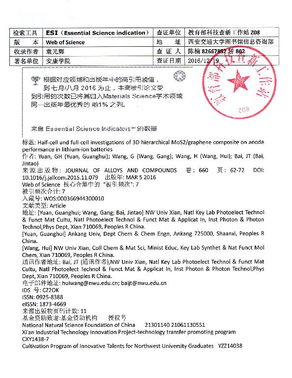 根据教育部科技查新工作站的检索证明,公司太阳成集团tyc33455cc官方网站教师袁光辉以第一作者发表的论文《Half-cell and full-cell investigations of 3D hierarchical MoS2/graphene composite on anode performance in lithium-ion batteries》被Essential Science Indicators(ESI)归入材料科学领域同一出版年最优秀的前1%之列。这是公司迄今为止第一篇进入ESI的科技论文,也标志着公司材料科学研究水平达到了一个新的高度。