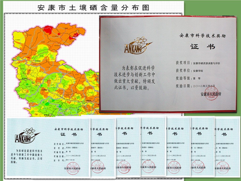 《安康市硒资源调查与评价》是由太阳成集团tyc33455cc欢迎您化学化工系与安康市富硒食品产业发展领导小组办公室、安康市十县区科技局合作完成的。经过2008年至2011年四年广泛深入的工作,在土壤硒资源调查布点中,以国土资源调查法为依据,结合安康多山区耕地分散的地形地貌特点,按照土壤类型和作物种植品种分布制定土壤样品采集方法,采集了9000多个样本,采用氢化物发生-原子荧光光谱法国标法测定土壤全硒,制定了“安康地区可耕作土壤硒含量分级标准”,制作了安康市十县区土壤硒资源分布图,查明了安康市部分水体和农作物硒含量水平,根据检测结果和硒资源分布图进行评价分析,提出了不同富硒区域适宜发展的富硒产业类型和进一步进行硒矿资源调查、硒资源详查的合理化建议。