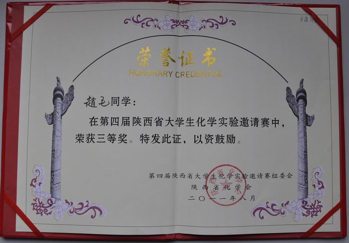 按照竞赛章程规定,我系选派2008级赵毛、郭淑红、张帆三位同学参赛,由实验中心副主任鲁绪会、指导教师屈兰竺带队。此次化学实验竞赛,经过理论笔试和实验操作两个环节的比拼,公司代表队三名选手凭借扎实的理论和实验功底,均荣获得个人成绩三等奖,为太阳成集团tyc33455cc欢迎您争取了荣誉。