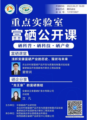 4月21日,员工集中线上直播观看了由安康市富硒产品研发中心举办的富硒公开课。农业农村部富硒产品开发与质量控制重点实验室夏曾润做了“浅析安康富硒产业的历史,现状和未来”的报告。安康龙王泉富硒矿泉水有限公司总经理沈凡做了“龙王泉的富硒情节”的报告。2018级应用化学、2021级应用化学专业员工参加。