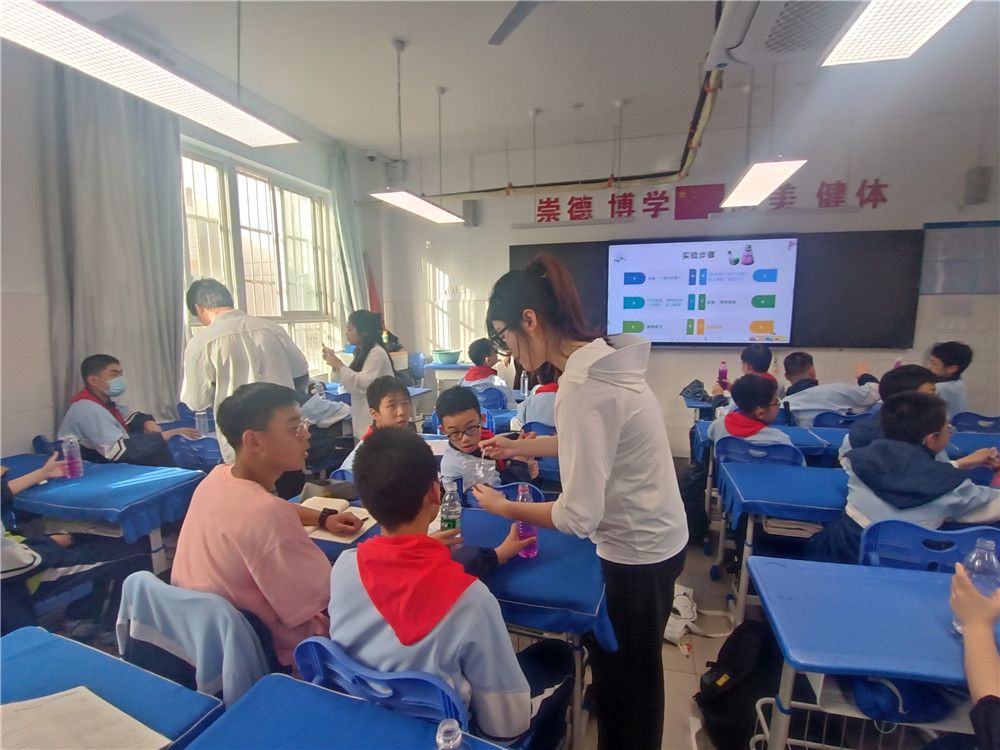 接着袁光辉、王晓林、王雪三位老师向同学们展示“掌中火”和“神奇的变色”两个富有趣味性和观赏性的实验,并邀请同学们上台亲自动手体验。最后,老师与科普团成员及员工党员们为同学们发放实验所需的高锰酸钾、vc片等实验用品,在三位老师的指导下,同学们一起摇动水瓶,观察水质变色的过程,感受化学反应的神奇魅力。实验过后,袁光辉向同学们解释原理,让同学们在实验中感受化学魅力,培养科学兴趣。