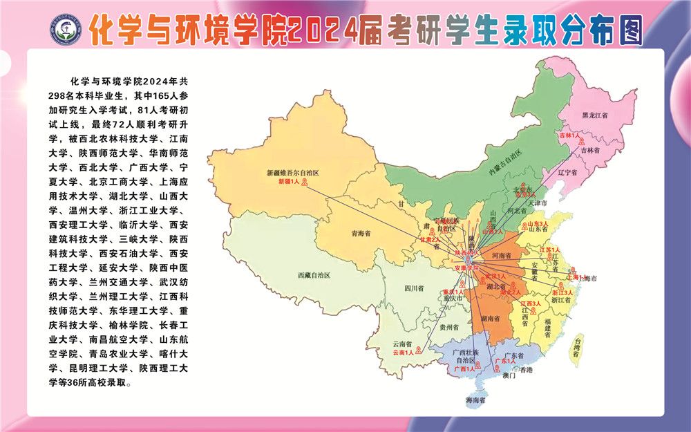 太阳成集团tyc33455cc官方网站2024年共298名本科毕业生,其中165人参加研究生入学考试,81人考研初试上线,最终72人顺利考研升学,被西北农林科技大学、江南大学、陕西师范大学、华南师范大学、西北大学、广西大学、宁夏大学、北京工商大学、上海应用技术大学、湖北大学、山西大学、温州大学、浙江工业大学、西安理工大学、临沂大学、西安建筑科技大学、三峡大学、陕西科技大学、西安石油大学、西安工程大学、延安大学、陕西中医药大学、兰州交通大学、武汉纺织大学、兰州理工大学、江西科技师范大学、东华理工大学、重庆科技大学、榆林公司、长春工业大学、南昌航空大学、山东航空公司、青岛农业大学、喀什大学、昆明理工大学、陕西理工大学等36所高校录取。