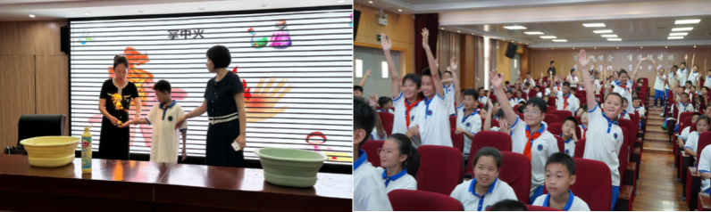 调研工作完成后,随着悠扬的音乐响彻校园,科普课堂正式开讲。课堂上,科普团老师先向同学们介绍了“什么是化学”以及“化学的重要性”。随后,老师演示了“掌中火”实验,并邀请同学们上前体验,神奇的“掌中火”引得孩子们惊叹连连。