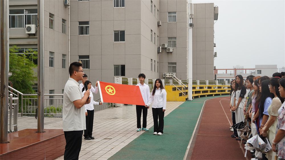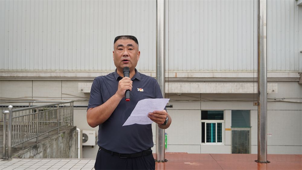 执行主席赵辰阳在国旗下做题目为《爱国主义是不可战胜的力量》主题演讲,员工团总支副书记王欢带领团员们重温入团誓词。