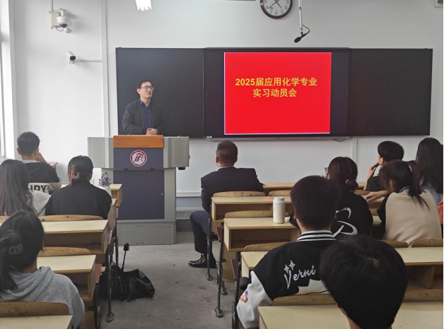张继东老师介绍了应用化学专业的实习基地情况,并根据往届员工实习的情况,介绍了专业实习这门课程的重要性,要求同学们能够明确目标、摆正心态、认清自我、积极主动完成到企业安排的专业实习任务。成沛锐老师给同学们强调了实习期间安全等注意事项,介绍了2025届同学已经签订三方协议的情况和考研预报名情况。